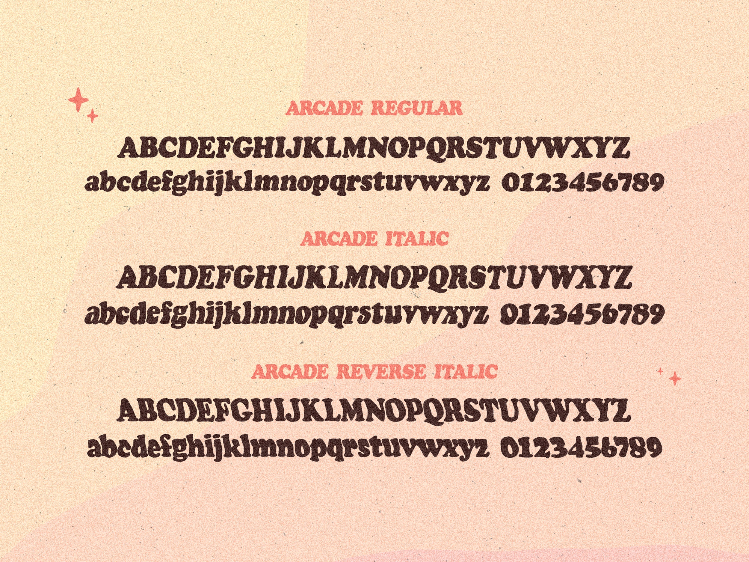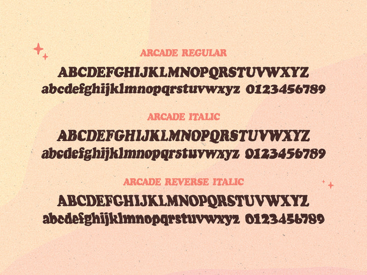 Includes: Arcade Regular / Arcade Italic / Arcade Reverse-Italic.
